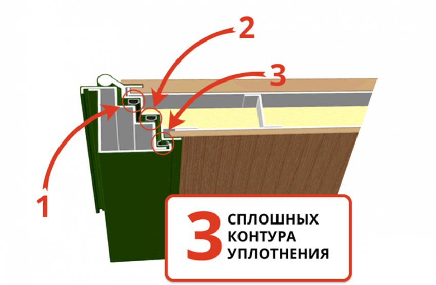 - применение двухконтурной или трёхконтурной системы уплотнения, цель которой — герметизация всей конструкции. В качестве уплотнителей используют прокладки из поливинилхлорида, пластика, резины или поролона. Для их размещения дверное полотно производится из гнутых профилей;
