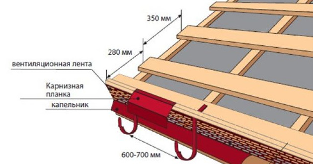 - К нижней доске обрешётки монтируется карнизная планка с нахлёстом в 5 см так, чтобы обеспечить сток влаги с кровли в жёлоб.