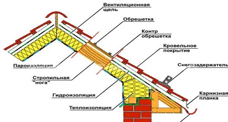 Монтаж такой : 1) на самый край стропил ставится металлический капельник; 2) непосредственно на стропила накладывается супердиффузионная мембрана таким образом, что между 1-ым поясом мембраны и капельником и в каждом следующем нахлёсту между мембранами получается нахлёст размера мин. 10 см, мембрана переходит через конёк без разреза под коньком; 3) на мембрану примениться контррейки (уклон меньше чем 25 градусов — толщины 60 мм, 25–45 градусов — 50 мм, больше чем 45 градусов — 40 мм); 4) применяется обрешётка; 5) на край обрешётки ставится капельник для кровельного покрытия; 6) ложится кровельное покрытие с вентилируемым коньком или с вентилируемыми элементами вблизи конька Т.е. вентзазор под кровельным покрытием обеспечивает испарение водянных паров из конструкции и испарение конденсатов из нижной стороны паронепроницаемого кровельного покрытия. Задуваемыйый сухой снег, через вентэлементы под кровельное покрытие ничего не повредит, так как он остаётся на мембране и когда растает, вода по мембране вытекает из конструкции на улицу.