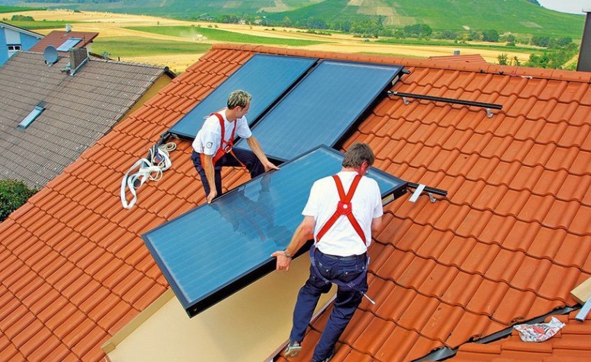 Лучше всего монтировать систему плоских коллекторов на скатной крыше