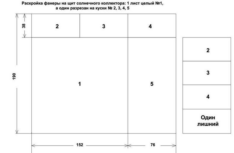 - Соберите короб для основания коллектора из двух листов фанеры размером 1,52х1,52 м толщиной 1 см. Один из них раскроите для создания бортиков на детали: размером 0,76х0,38 м — 4 шт., размером 1,52х0,76 м — 1 шт.