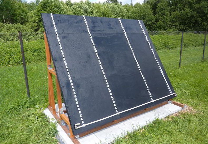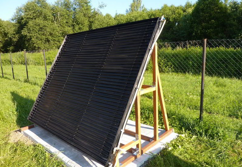 Устройство представляет собой панель, внутри которой расположены медные трубки с тёмным покрытием. В них нагревается вода, которая потом собирается в баке и применяется для ГВС (горячего водоснабжения). Если делать коллектор самостоятельно, то дорогостоящие составляющие можно заменить доступными материалами: