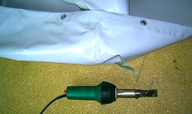 - Берём ПВХ полотно и раскраиваем его в зависимости от размеров конструкции, не забывая о припусках около 20–30 мм на склеивание. Выбираем необходимую температуру сварки в зависимости от рекомендаций производителя. Раскладываем ткань с нахлёстом и разогреваем места стыков горячим феном до небольшого плавления, чтобы она не подгорела.