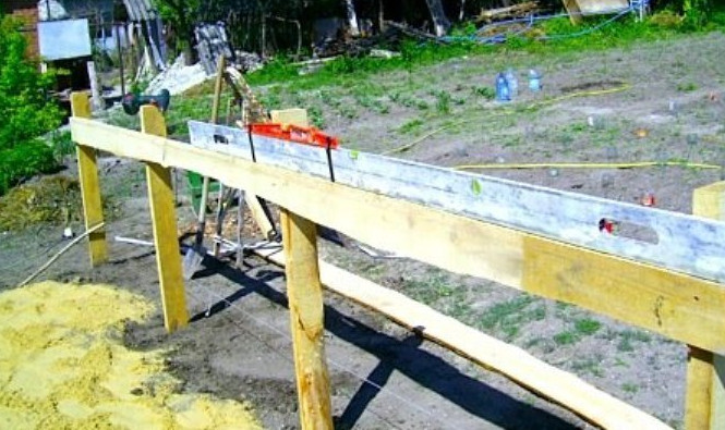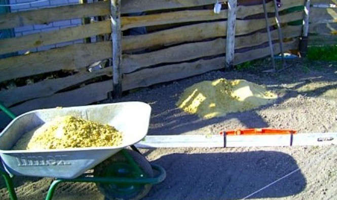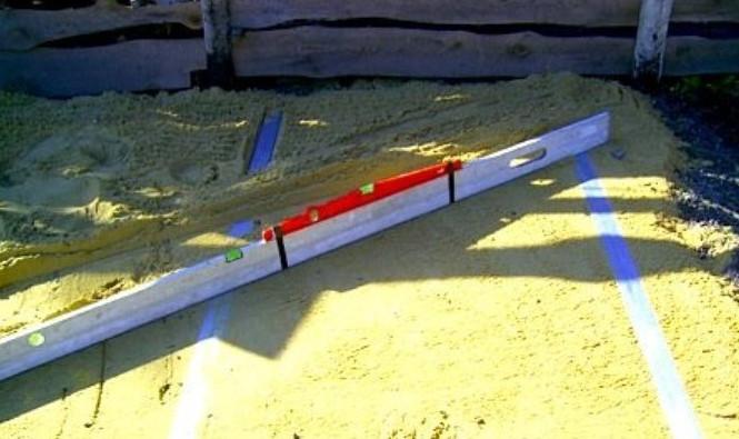 - Поверхность должна быть достаточно ровной и чистой, чтобы каркас стоял прямо, без перекосов. На грунт высыпаем песок, толщиной около 5–10 см и разравниваем его. Для удобства работы устанавливаем маяки и правилом или обычной доской разравниваем песок.