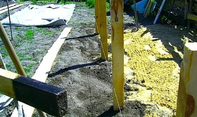 - Затем буром проделываем скважины (ямы) глубиной около 50–70 см. По длинной стороне устанавливаем две опоры, кроме угловых. У нас должны получиться промежутки около 1,4 метра. По ширине устанавливаем по одной опоре с двух сторон. Столбы ставим вертикально, следя за линией. Для этого берём специальный строительный шнур, который можно натянуть по всему периметру основания. Стойки устанавливаем в вырытые ямы и засыпаем их щебнем, а затем хорошо утрамбовываем. Нижнюю часть бруса перед закапыванием оборачиваем кусками битума для продления его срока службы.