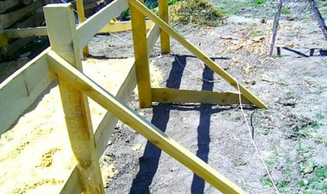 - По уровню размечаем будущее размещение ступенек с шагом около 25 см. Крепим в этих местах напротив друг друга опорные бруски. Ступни выпиливаем из широкой доски и кладём их на опоры. У нас должно получиться 4 ступеньки, а верхнюю крепим к обвязке, чтобы получилась небольшая площадка у самого края бассейна.