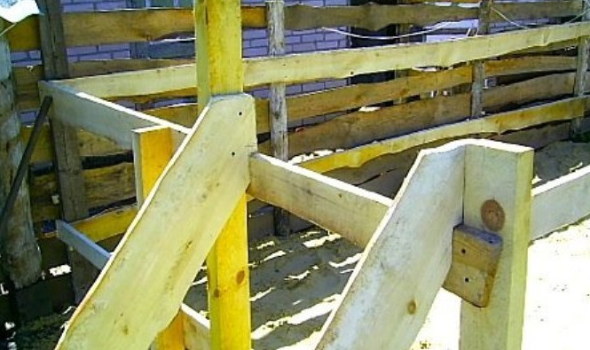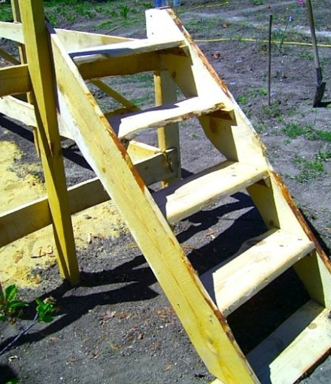 - После того как каркас сделан, необходимо установить лестницу. Для этого на расстоянии около 60 см от угла каркаса мы устанавливаем дополнительную прочную стойку. Берём необрезную доску и выпиливаем две широкие тетивы, которые снизу крепим на опорную площадку. Сверху прикручиваем их к опорам и опираем на верхнюю часть обвязки.