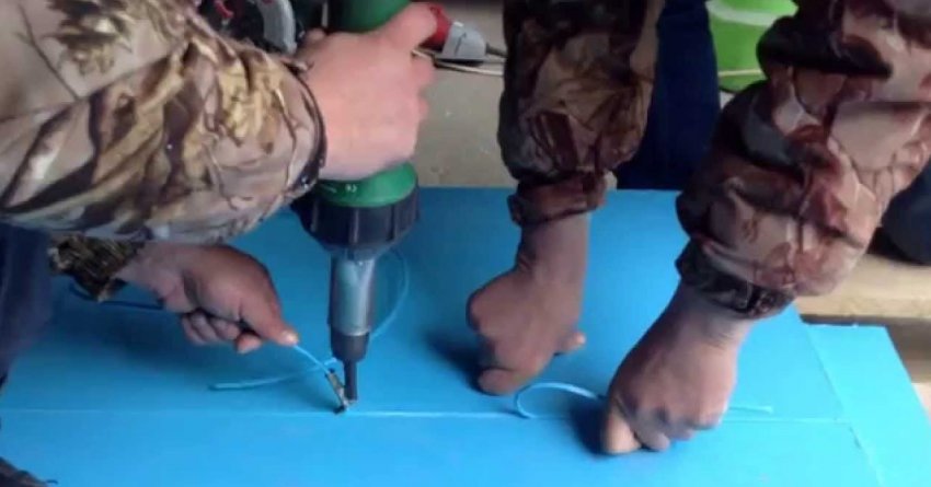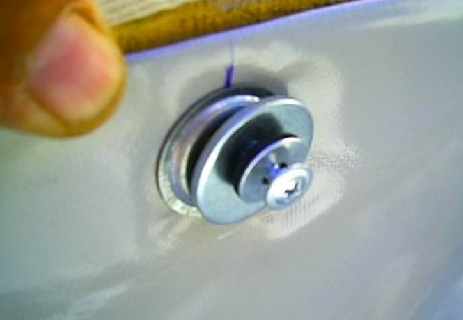 - После того как вся чаша склеена, загибаем края по периметру изделия примерно на 50–70 мм и также их провариваем феном. По всему краю получившегося бортика мы прикрепляем люверсы с помощью специального инструмента. Располагаем люверсы (металлические кольца) через каждые 50 см чаши бассейна.