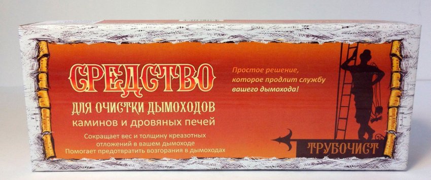 - «Трубочист». Одно из самых популярных средств для химической чистки дымоходов. Выпускается в виде брусков, выглядит как полено, сжигается вместе с дровами в топке. Полено горит в среднем 2 часа, но продолжает действовать в течение двух недель после сжигания, активно разрушая сажу;