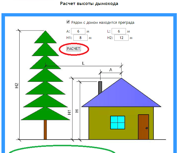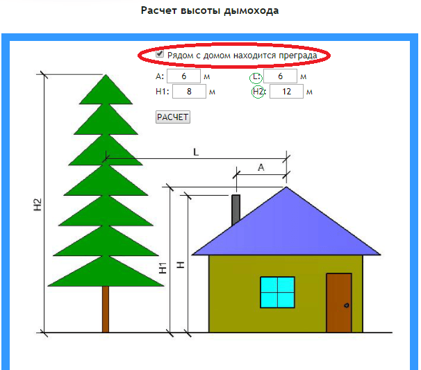 При включении в расчёт дополнительного параметра — наличия преграды перед домом — появляются новые поля: расстояние от дымохода до преграды L и высота преграды H2