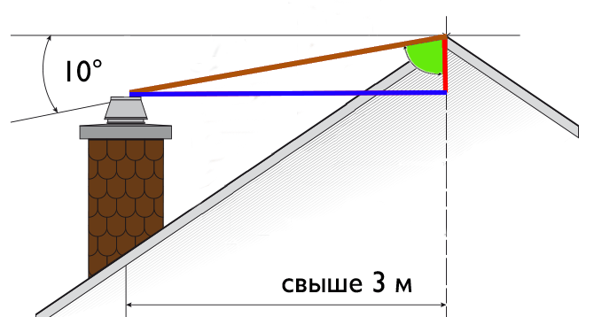 - при большем удалении дымоотводящей трубы высота её установки определяется вымышленной линией, проведённой от конька под углом в 10o к горизонту.