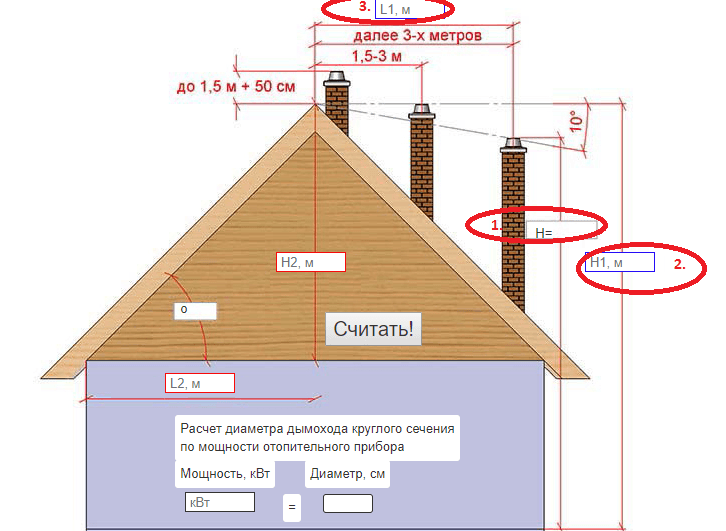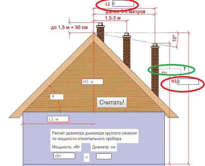 - Это простейший и наглядный сервис, который требует ввести всего два параметра: высоту дома и расстояние от конька до дымохода.