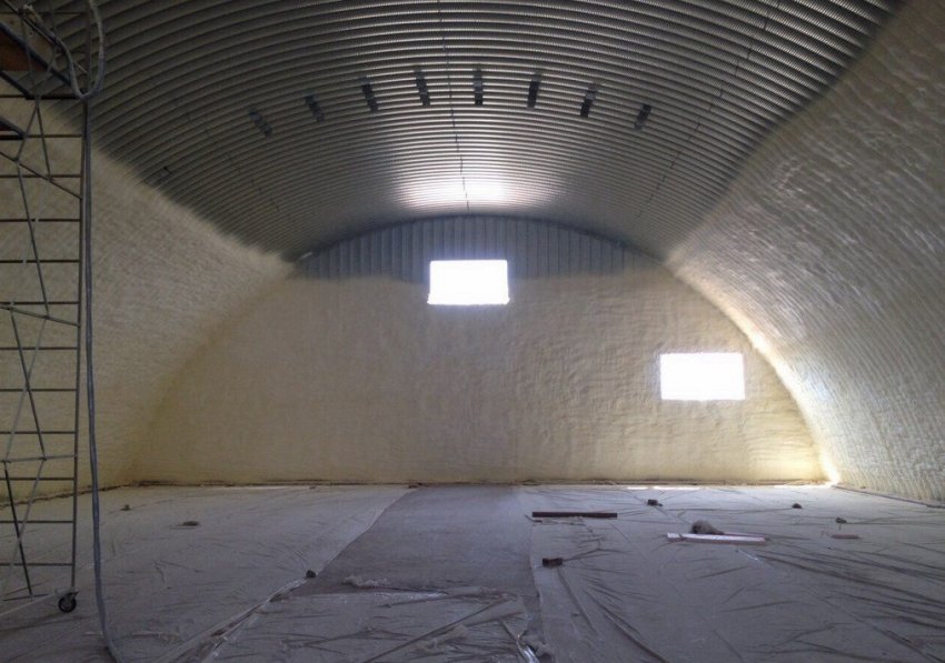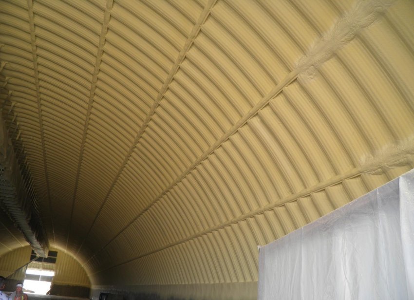 Данные, приведённые в таблице, указывают, что пенополиуретан втрое эффективнее минеральной или каменной ваты. Кроме того, технология напыления позволяет создать равномерный слой без стыков, щелей, мостиков холода и необходимости в дополнительной паро-, влаго- и ветрозащитной мембране. В результате утепление выполняется быстро и максимально эффективно, что позитивно сказывается на сроке окупаемости ангара. Поскольку метод напыления можно применять на металлоконструкциях любого возраста (материал хорошо липнет к основанию и не перегружает конструктив), ППУ активно используется для усовершенствования и перепрофилирования старых ангаров.