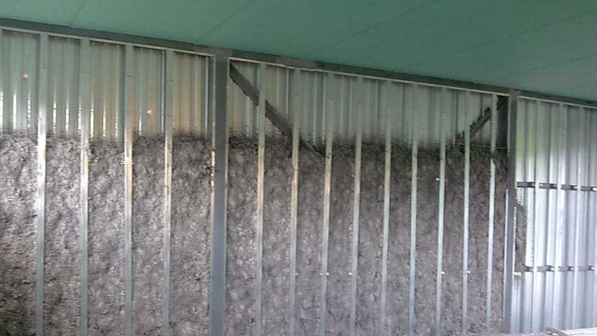 При мокром нанесении эковата хорошо держится на профлистах и без внутренней обшивки ангара