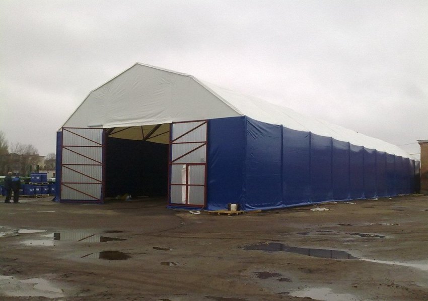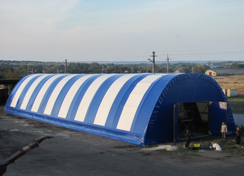 - тенты из ПВХ-полотна. Они применяются только для неутеплённых временных ангаров. Главное достоинство обшивки в виде чехла — быстрый монтаж, который и позволяет сделать ангар максимально мобильным. Если вам нужен ангар, который будет ставиться на 1–2 недели во время сбора урожая или на 1–2 дня для проведения спортивных матчей, стоит выбрать именно тент. Благодаря небольшой массе, он может ставиться на облегчённый каркас, что позволит значительно сэкономить при покупке. Кроме того, при эпизодической эксплуатации ПВХ-ткань будет служить много лет;