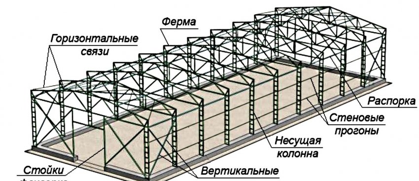 Каркас ангара состоит из нескольких поперечных ферм, соединных продольными балками-прогонами