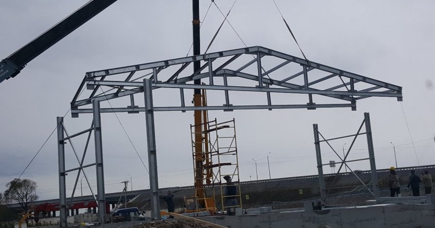 Чтобы надёжно соединить фермы с несущими колоннами, понадобится кран и специалисты по высотным работам. Для безопасности людей используйте прочные строительные леса и страховочные тросы.