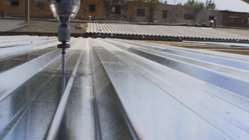 Крепление профнастила производится специальными кровельными саморезами с герметичными резиновыми шайбами