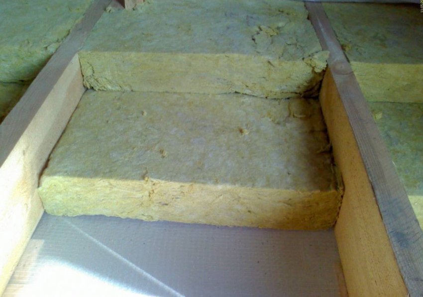 - Расположите в подготовленных ячейках листы минеральной ваты в два слоя со смещением на половину длины блока.