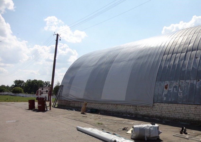 Если протеканий очень много, их можно устранить, накрыв ангар тентом из ПВХ-ткани. Благодаря сварному соединению швов он не пропустит воду даже при самой плохой погоде. Поскольку тент не пропускает воздух, при монтаже следует обеспечить герметичный стык между тканью и выступающими из крыши элементами вентиляционной системы. Такая технология лучше всего подходит для неутеплённых ангаров, а также конструкций, утеплённых непромокаемым термоизолятором. Если же при обустройстве ангара использовалась каменная или стекловата, после устранения течи потребуется разобрать внутреннюю обшивку и заменить утеплитель (эковату можно просто высушить).