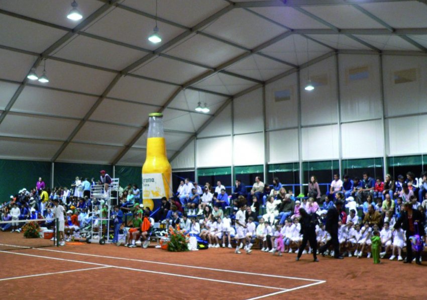 В этом ангаре с ломаной крышей очень удачно разместился теннисный корт с трибунами для зрителей