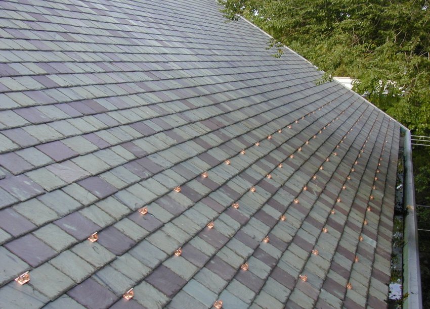 Крепление плиток сланцевой кровли к обрешётке производится медными гвоздями.