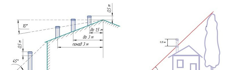 Для того чтобы дымоход создавал хорошую тягу, его оголовок должен находиться на определённой высоте, которая зависит от расстояния до конька