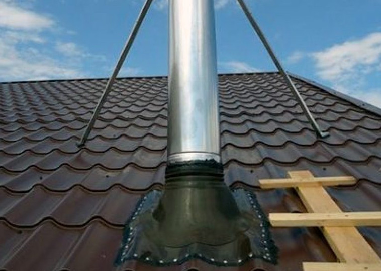 Для устранения возможности протечки в месте пересечение дымохода с кровельным пирогом устанавливается специальный фартук
