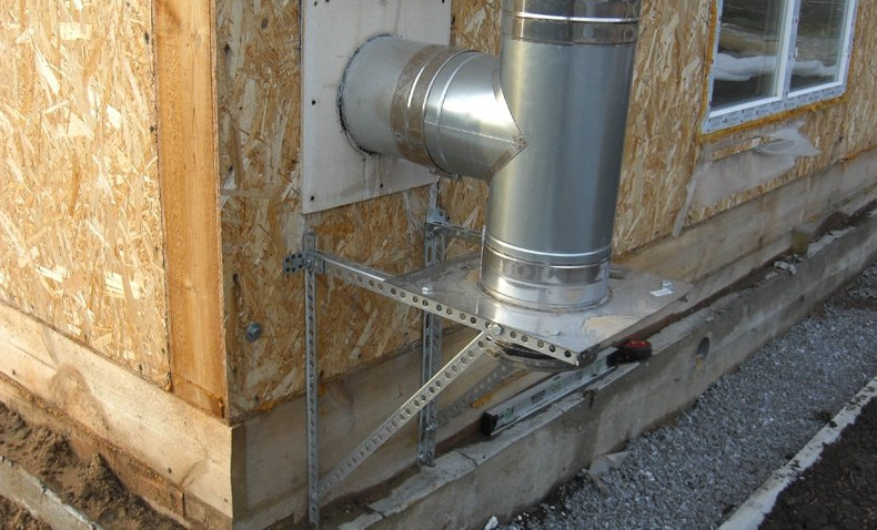 В месте выхода дымохода из стены устанавливается тройник с конденсатосборником и настенный кронштейн, принимающий на себя нагрузку вертикального участка конструкции