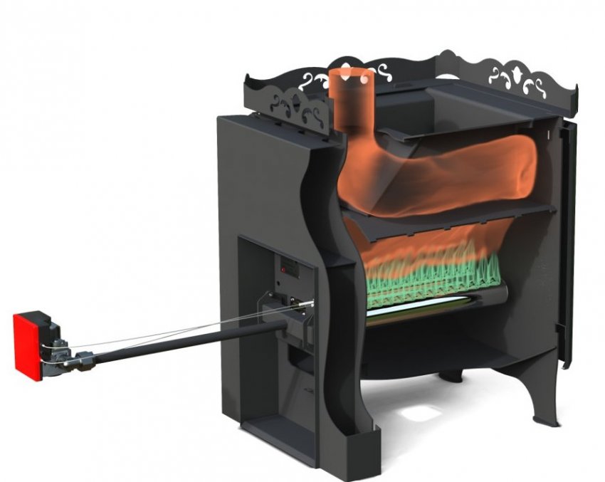 У родителей на татарике в бане обычная печь,в нее установлена с горелка на газу… работает уже много лет, нет грязи от дров, очень удобно, в повседневке работает на «фитиле»,а захотел в баньку за 2 часа добавил газку и отличный жар! запаха дыма дров конешна нет, НО это дело вкуса у брата баня работает по другому принципу, себе буду строить также… из дома в баню брошены трубы от основного газкотла для подогрева теплого пола в баньке, постоянно тепло, а захотел жару затопил печь дровами с дымком