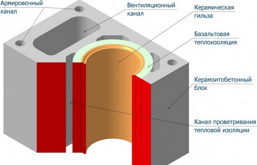 Керамические трубы монтируются внутри специальных керамзитобетонных блоков. По их оси выполнено отверстие для установки дымохода. Диаметр отверстия в блоке на 50–70 миллиметров больше наружного размера трубы — в этом промежутке размещается негорючий теплоизолятор, в качестве которого используется минеральная или базальтовая вата. По углам в блоках выполнены отверстия для установки стержней арматуры, упрочняющих конструкцию.