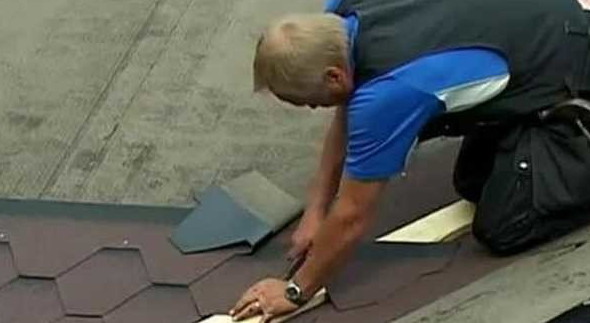 - Как только все верхние гонты будут подрезаны, материал скрепляется по краям на битумную мастику.