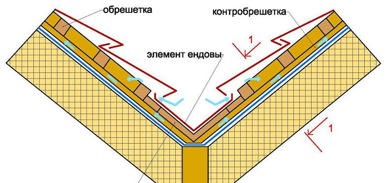 Декоративная планка ендовы и слой металлочерепицы кладётся без дополнительного утеплителя.
