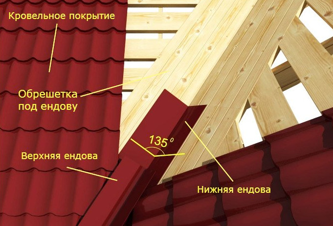 Кровельный узел примыкания скатов состоит из двух планок — нижней и верхней ендовы. В местах образования отрицательных стыковых углов ставится нижняя планка для того, чтобы надёжно закрыть подкровельное пространство и предотвратить попадание воды в район соединения скатных поверхностей. Установка нижней ендовы осуществляется до момента покрытия крыши кровельным материалом. Верхняя ендова выступает в качестве декоративного элемента, который крепится поверх кровли.