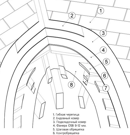 Крыша с мягким кровельным покрытием может строиться с закрытой ендовой, тогда пологий скат покрывается рядовой черепицей с накладкой гонтов поверх крутого ската от 30 см: