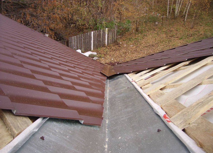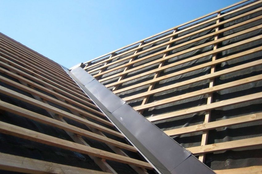 В месте стыка скатов укладывается сплошная обрешётка и дополнительный слой гидроизоляции