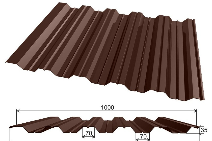 - материал НС-35 относится к универсальному типу профнастила, имеет гофру высотой 35 мм, полезную ширину 1000 мм. Толщина стали составляет от 0,4 до 0,8 мм. Листы могут быть с цинковым или полимерным покрытием. Материал имеет трапециевидный профиль, что оптимально для крыши с любым уклоном скатов.