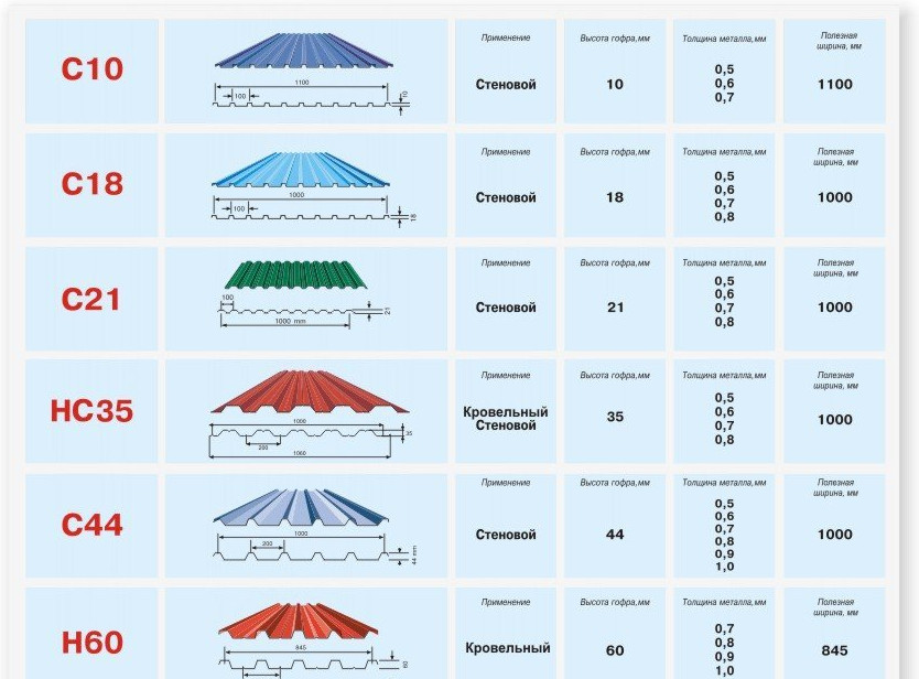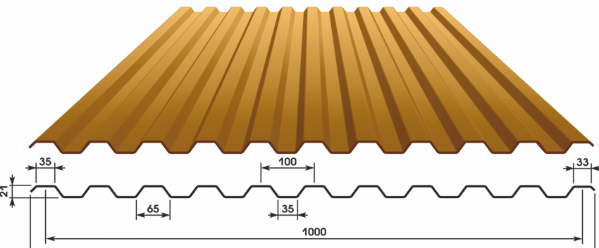 - металлопрофиль — лист С21–1150 с оцинкованным или полимерным покрытием — рабочая ширина 1 метр, длина 2 или 2,2 метра;