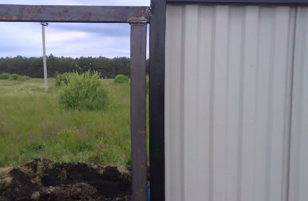 - Вначале размечаем место, где будем устанавливать калитку и делаем проём в заборе определённой ширины между двумя металлическими опорами. В будущем мы будем приваривать к ним трубы, которые будут составлять каркас калитки. Выбирая такую схему, мы изначально будем уверены, что готовая калитка точно подойдёт по всем параметрам. Тогда проблемы, которые возникают при сваривании калитки в другом месте, не появятся.