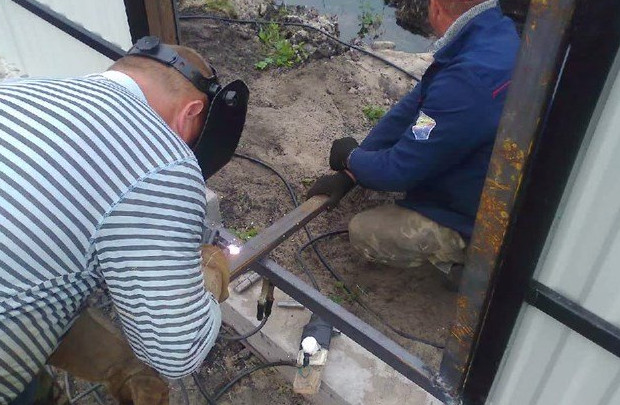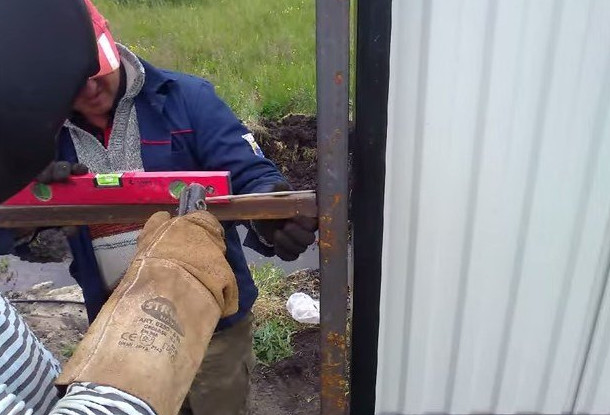 При сварке второго конца перекладины проверяется горизонтальность её установки