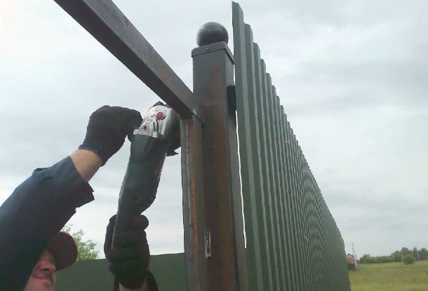 - Снимаем калитку и привариваем петли более тщательно, а затем зачищаем все швы. Во время сварки необходимо подкладывать асбестовый лист или обычный картон, чтобы искры и окалина не попали на профнастил забора.