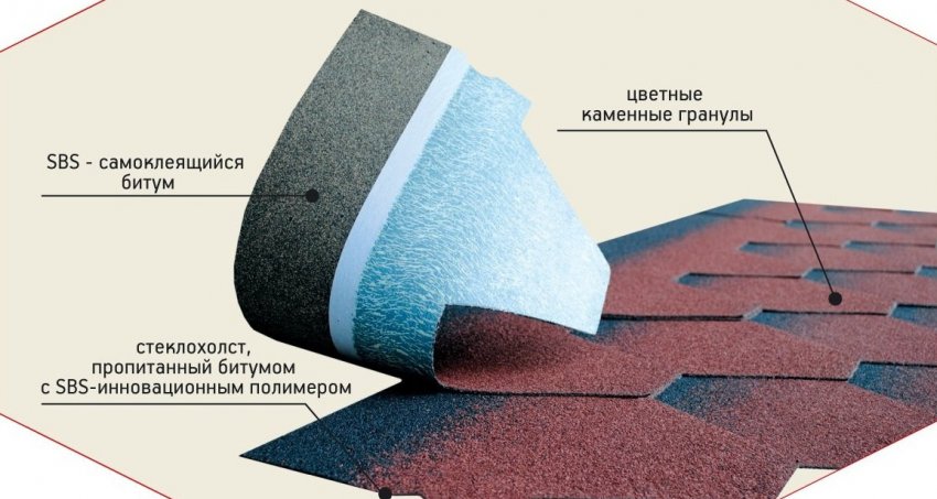 СБС-модифицированный битум придаёт гибкой черепице эластичность, а стекохолст и каменный гранулят — прочность