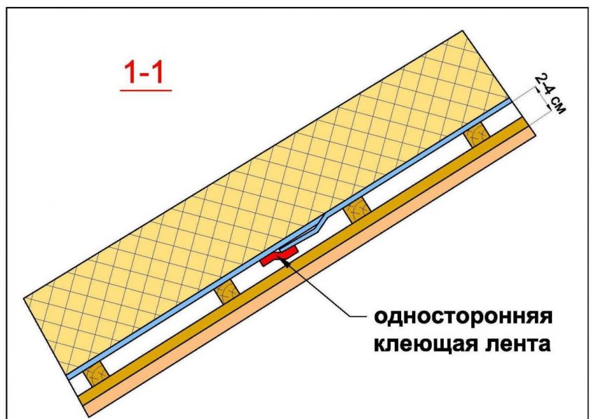 Стыки слоёв пароизоляционной плёнки проклеиваются специальным строительным скотчем