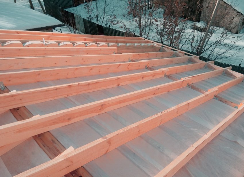 - На плёночный материал закрепите тонкие деревянные рейки, которые предварительно обработайте специальным антисептиком. При этом расстояние между ними должно быть около 50 см. Таким образом, создаётся обрешётка, фиксирующая отделочный материал. В итоге между внутренней отделкой кровли и пароизоляционным материалом получится просвет (2–5 см), который нужен для естественной вентиляции.