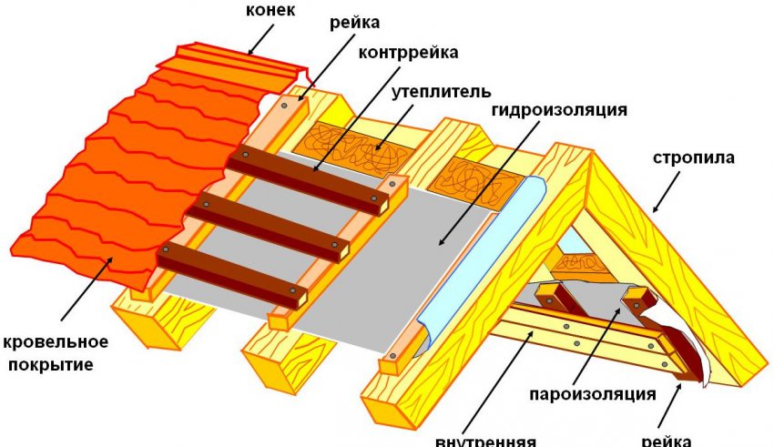 Обустраивая металлочерепичную крышу, в качестве гидро- и паробарьерного слоя применяйте лишь материал, который слабо горит.