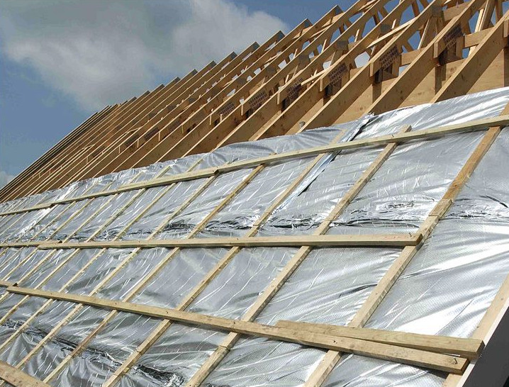 Гидроизоляция производится после того, как будет выполнена система стропил и обрешётка, а также уложен утеплитель: