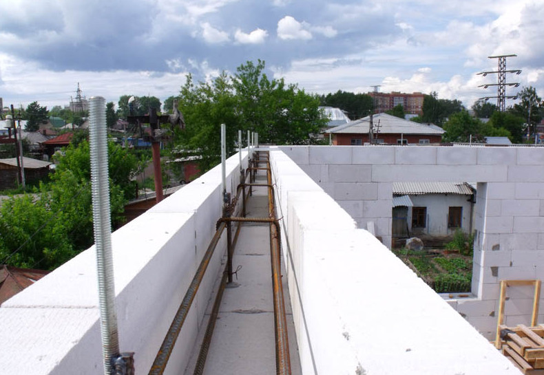 - Для стен из кирпича или бетонных блоков изготавливается армирующий пояс. В него монтируются шпильки из стали, на которые затем будет надеваться мауэрлат. Конструкция армопояса требуется не только для распределения нагрузок от крыши, но и для горизонтального выравнивания торцевых поверхностей стен. Без этого элемента в разных частях крыши уклон может быть разным.