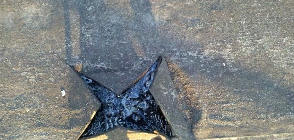 Место повреждения кровельного покрытия необходимо разрезать нажом крест на крест и отогнуть