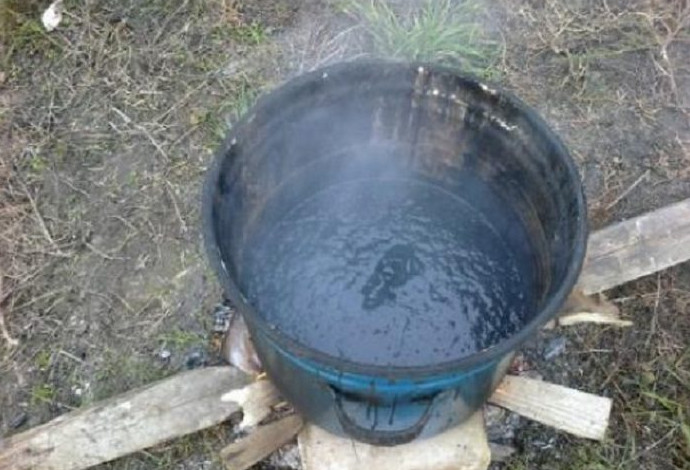 - Прежде всего надо разогреть битум. Для этого надо разжечь костёр и сделать самодельный мангал, на котором будет расположено ведро. Когда битум нагреется и станет пластичным, можно приступать к заливке.