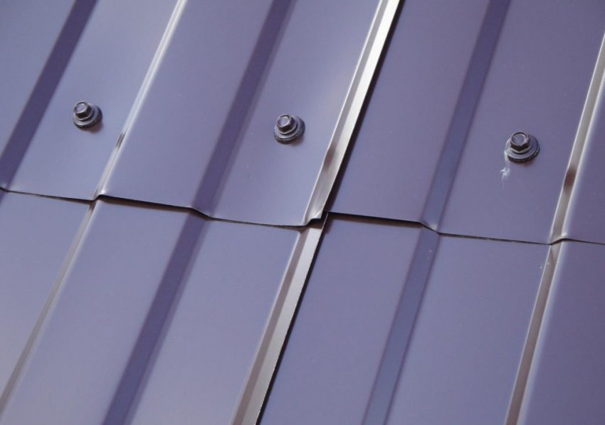 - Поверх гидроизоляционного материала укладывается металлическая кровля. Профлисты закрепляются к обрешётке при помощи особых самонарезающих винтов с подкладками из резины. Для удобства можно предварительно проделать маленькие отверстия в основании. Саморезы нужно вкручивать без натяга, чтобы материал мог сжиматься и расширяться при изменении температуры.